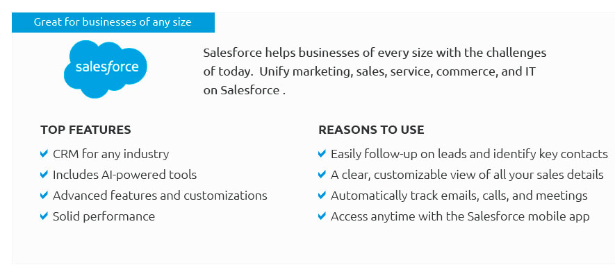 - Salesforce: Ideal for customized, enterprise-level solutions.